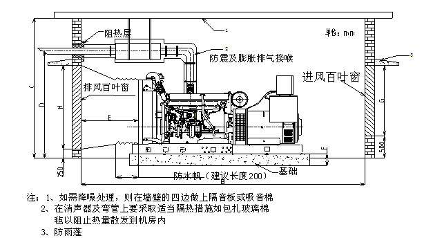 c.為了降低機(jī)房溫度,排煙管道應(yīng)用隔熱材料包扎;如果允許的話,盡可能將消聲器及大部分排煙管安排在機(jī)房外。