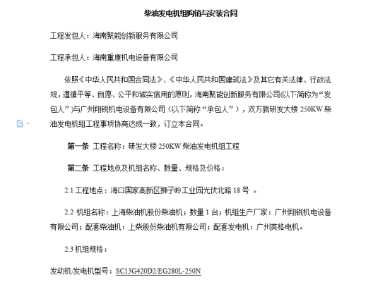 我公司為海南聚能創(chuàng)新供應250KW上柴股份柴油機